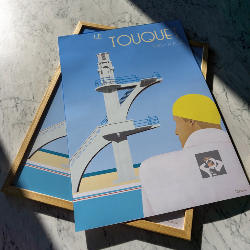Poster Le Touquet – RAZZIA by the artist Gérard Courbouleix (Razzia) (who signs his works “Razzia". Born in 1950 in the Montparnasse district of Paris, he is considered one of the last true “poster artists” — artists who still create posters starting from original paintings, often reproduced as lithographs or serigraphs, rather than digital compositions. Strongly influenced by Art Deco: clean lines, elegant stylisation, smooth gradients, and a glamorous atmosphere.
